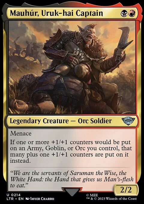 Menace If one or more +1/+1 counters would be put on an Army, Goblin, or Orc you control, that many plus one +1/+1 counters are put on it instead.