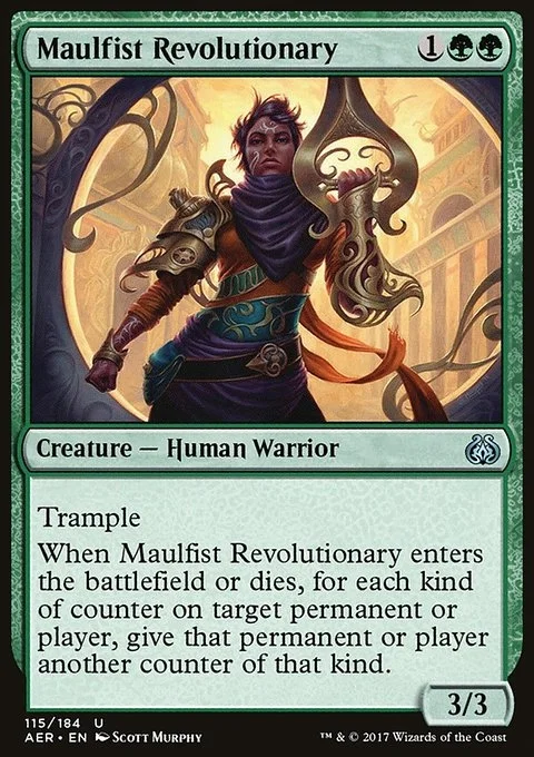 Trample When Maulfist Revolutionary enters the battlefield or dies, for each kind of counter on target permanent or player, give that permanent or player another counter of that kind.