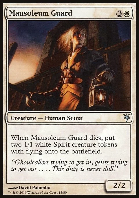 When Mausoleum Guard dies, create two 1/1 white Spirit creature tokens with flying.