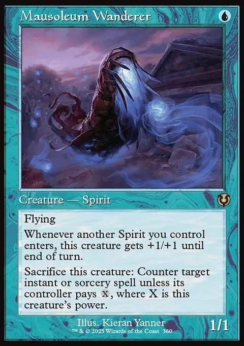 Flying Whenever another Spirit you control enters, this creature gets +1/+1 until end of turn. Sacrifice this creature: Counter target instant or sorcery spell unless its controller pays {X}, where X is this creature's power.