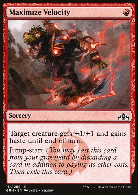 Target creature gets +1/+1 and gains haste until end of turn. Jump-start (You may cast this card from your graveyard by discarding a card in addition to paying its other costs. Then exile this card.)