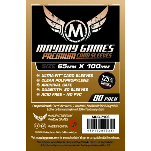 If you want sleeves for 7 Wonders, these are the sleeves you want. Clear on both sides so you can use them for any and all 7 Wonders cards, and they are a snug fit so shuffling is a beeeze. They will bloat how much space the cards take up, but they still fit in the original insert so it’s worth it.