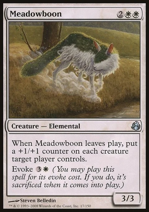 When Meadowboon leaves play, put a +1/+1 counter on each creature target player controls.