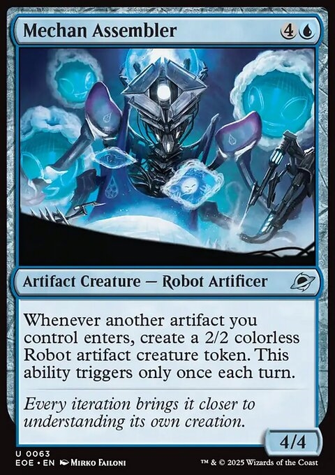 Whenever another artifact you control enters, create a 2/2 colorless Robot artifact creature token. This ability triggers only once each turn.