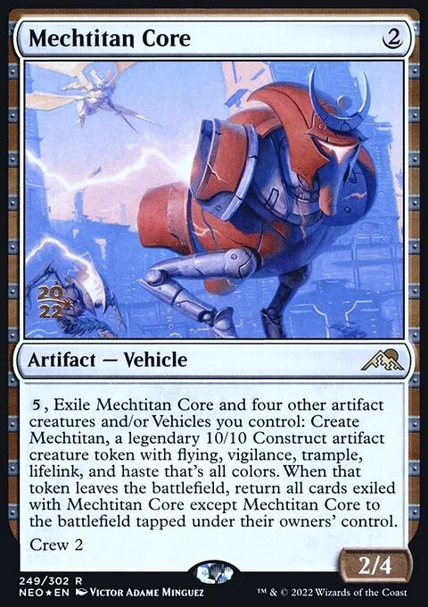 {5}, Exile this Vehicle and four other artifact creatures and/or Vehicles you control: Create Mechtitan, a legendary 10/10 Construct artifact creature token with flying, vigilance, trample, lifelink, and haste that's all colors. When that token leaves the battlefield, return all cards exiled with this Vehicle except this card to the battlefield tapped under their owners' control.