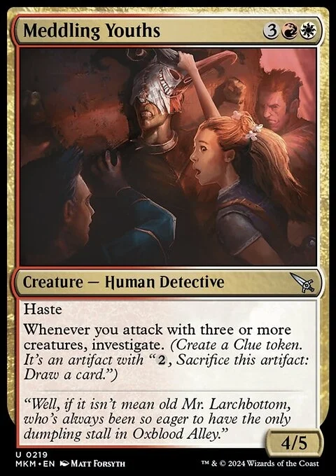 Haste Whenever you attack with three or more creatures, investigate. (Create a Clue token. It's an artifact with "{2}, Sacrifice this token: Draw a card.")