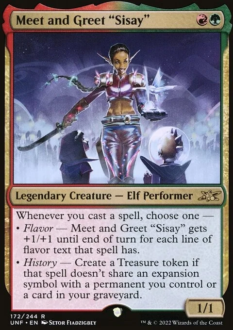Whenever you cast a spell, choose one — • Flavor — Meet and Greet "Sisay" gets +1/+1 until end of turn for each line of flavor text that spell has. • History — Create a Treasure token if that spell doesn't share an expansion symbol with a permanent you control or a card in your graveyard.