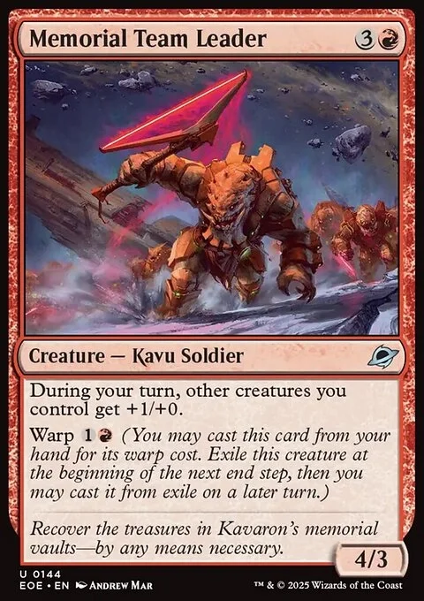 During your turn, other creatures you control get +1/+0. Warp {1}{R} (You may cast this card from your hand for its warp cost. Exile this creature at the beginning of the next end step, then you may cast it from exile on a later turn.)