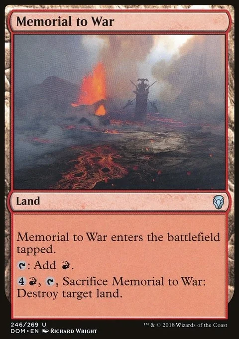 Memorial to War enters the battlefield tapped. {T}: Add {R}. {4}{R}, {T}, Sacrifice Memorial to War: Destroy target land.
