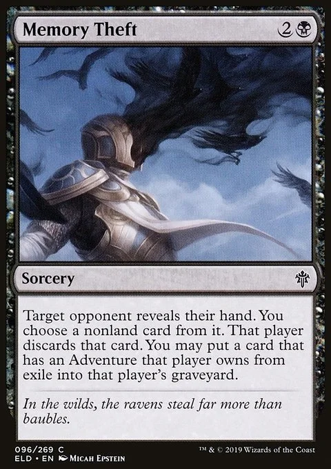 Target opponent reveals their hand. You choose a nonland card from it. That player discards that card. You may put a card that has an Adventure that player owns from exile into that player's graveyard.