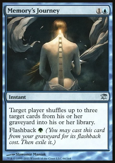 Target player shuffles up to three target cards from their graveyard into their library. Flashback {G} (You may cast this card from your graveyard for its flashback cost. Then exile it.)