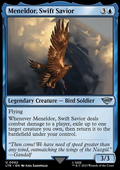Flying Whenever Meneldor, Swift Savior deals combat damage to a player, exile up to one target creature you own, then return it to the battlefield under your control.