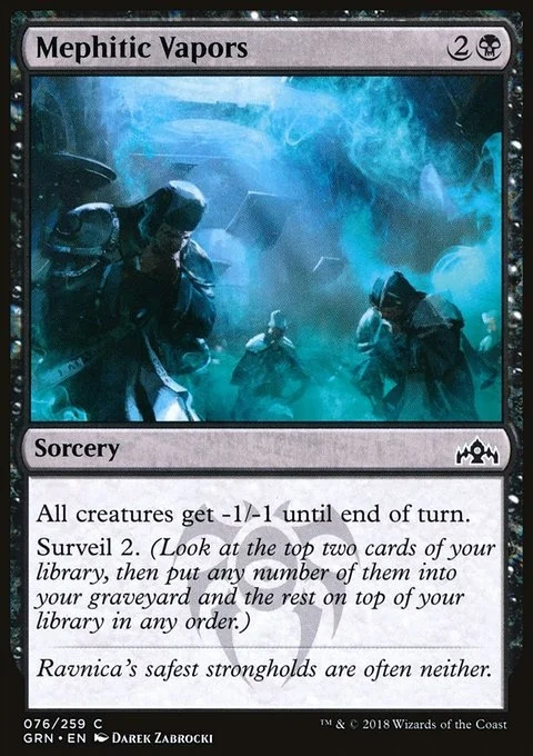 All creatures get -1/-1 until end of turn. Surveil 2. (Look at the top two cards of your library, then put any number of them into your graveyard and the rest on top of your library in any order.)