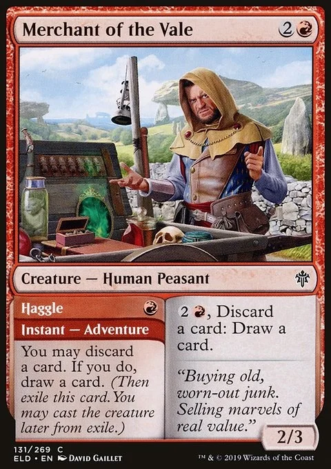 Merchant of the Vale {2}{R}, Discard a card: Draw a card. Haggle You may discard a card. If you do, draw a card. (Then exile this card. You may cast the creature later from exile.)