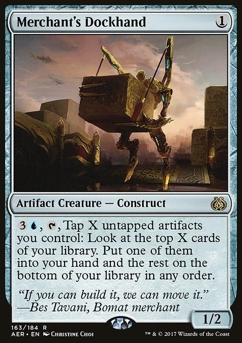 {3}{U}, {T}, Tap X untapped artifacts you control: Look at the top X cards of your library. Put one of them into your hand and the rest on the bottom of your library in any order.