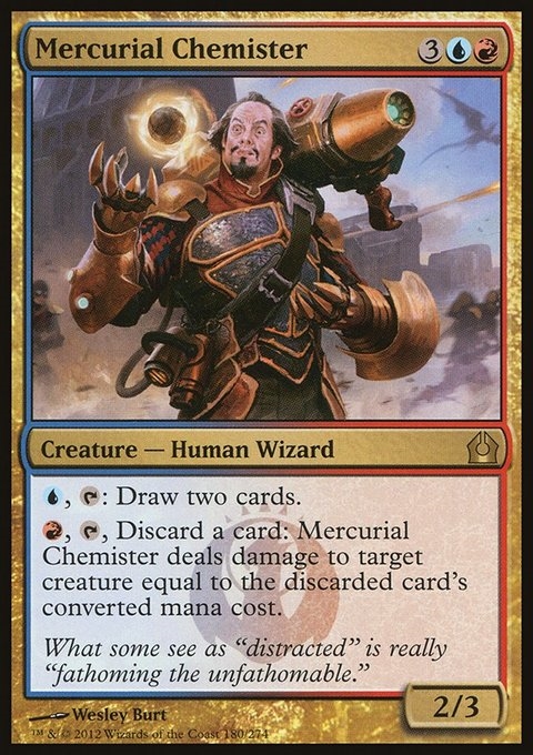 R, T, Discard a card: Mercurial Chemister deals damage to target creature equal to the discarded card's converted mana cost.