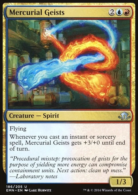 Flying Whenever you cast an instant or sorcery spell, Mercurial Geists gets +3/+0 until end of turn.