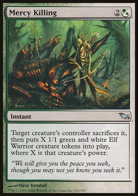 Target creature's controller sacrifices it, then puts X 1/1 green and white Elf Warrior creature tokens into play, where X is that creature's power.