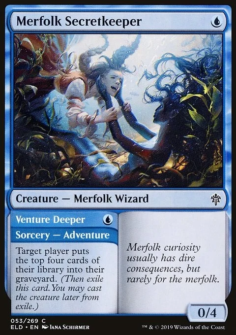 Merfolk Secretkeeper Venture Deeper Target player puts the top four cards of their library into their graveyard. (Then exile this card. You may cast the creature later from exile.)