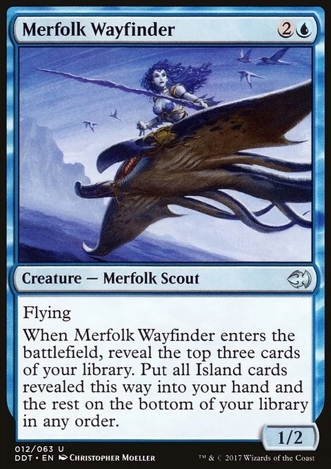 Flying When Merfolk Wayfinder enters the battlefield, reveal the top three cards of your library. Put all Island cards revealed this way into your hand and the rest on the bottom of your library in any order.