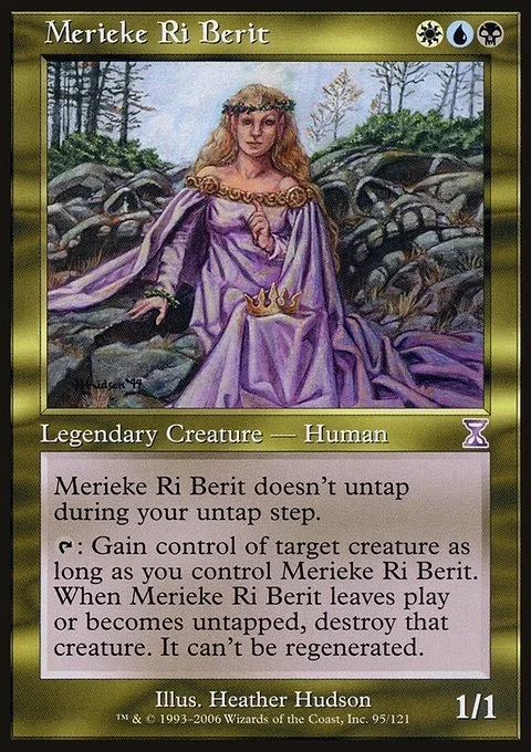 Merieke Ri Berit doesn't untap during your untap step. {T}: Gain control of target creature for as long as you control Merieke Ri Berit. When Merieke Ri Berit leaves the battlefield or becomes untapped, destroy that creature. It can't be regenerated.