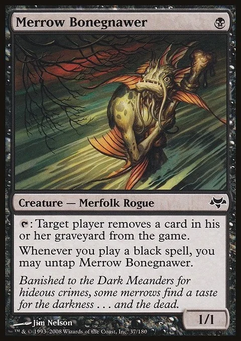 {T}: Target player exiles a card from their graveyard. Whenever you cast a black spell, you may untap Merrow Bonegnawer.