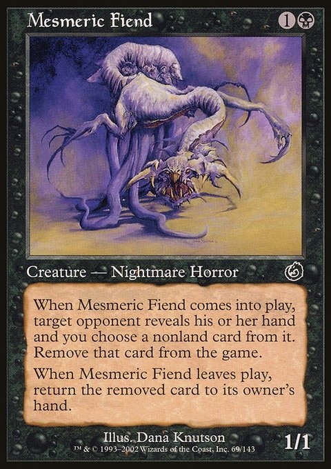 When Mesmeric Fiend enters, target opponent reveals their hand and you choose a nonland card from it. Exile that card. When Mesmeric Fiend leaves the battlefield, return the exiled card to its owner's hand.