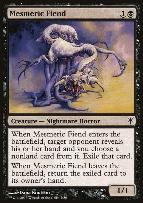 When this creature enters, target opponent reveals their hand and you choose a nonland card from it. Exile that card. When this creature leaves the battlefield, return the exiled card to its owner's hand.
