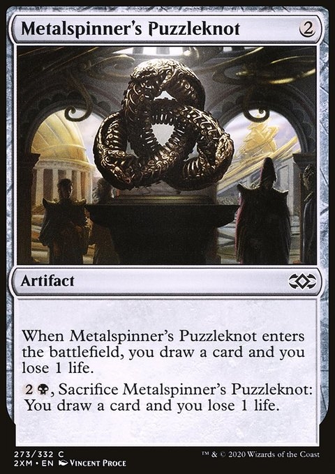 When Metalspinner's Puzzleknot enters the battlefield, you draw a card and you lose 1 life. {2}{B}, Sacrifice Metalspinner's Puzzleknot: You draw a card and you lose 1 life.