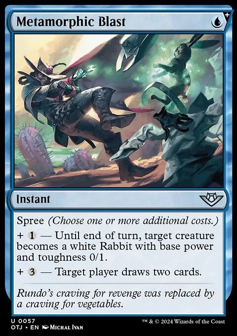 Spree (Choose one or more additional costs.) + {1} — Until end of turn, target creature becomes a white Rabbit with base power and toughness 0/1. + {3} — Target player draws two cards.