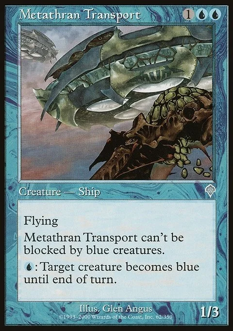 Flying Metathran Transport can't be blocked by blue creatures. {U}: Target creature becomes blue until end of turn.