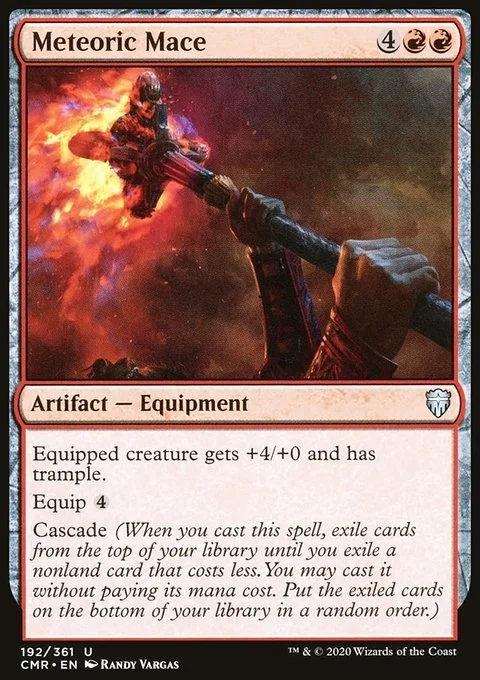Equipped creature gets +4/+0 and has trample. Equip {4} Cascade (When you cast this spell, exile cards from the top of your library until you exile a nonland card that costs less. You may cast it without paying its mana cost. Put the exiled cards on the bottom of your library in a random order.)