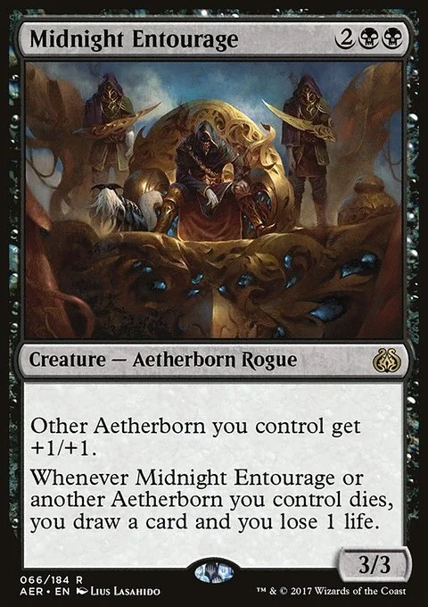 Other Aetherborn you control get +1/+1. Whenever Midnight Entourage or another Aetherborn you control dies, you draw a card and you lose 1 life.