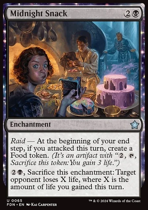 Raid — At the beginning of your end step, if you attacked this turn, create a Food token. (It's an artifact with "{2}, {T}, Sacrifice this token: You gain 3 life.")