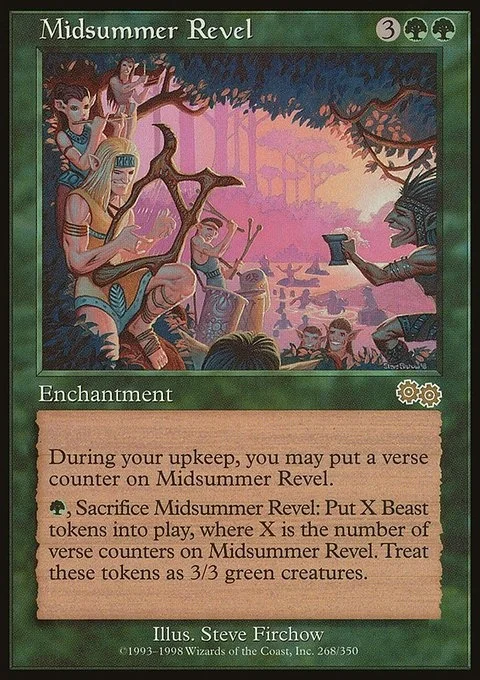 During your upkeep, you may put a verse counter on Midsummer Revel.G, Sacrifice Midsummer Revel: Put X Beast tokens into play, where X is the number of verse counters on Midsummer Revel. Treat these tokens as 3/3 green creatures.