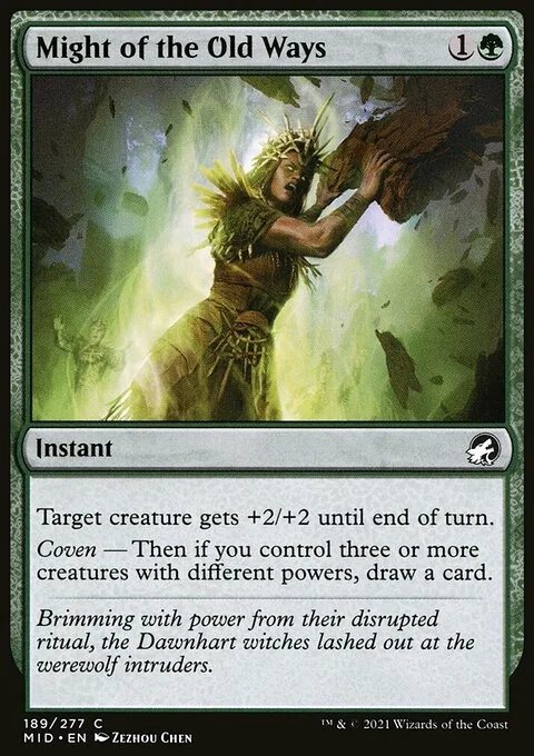 Target creature gets +2/+2 until end of turn. Coven — Then if you control three or more creatures with different powers, draw a card.