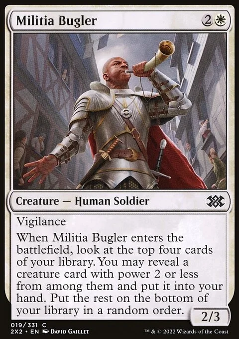 Vigilance (Attacking doesn't cause this creature to tap.) When this creature enters, look at the top four cards of your library. You may reveal a creature card with power 2 or less from among them and put it into your hand. Put the rest on the bottom of your library in a random order.