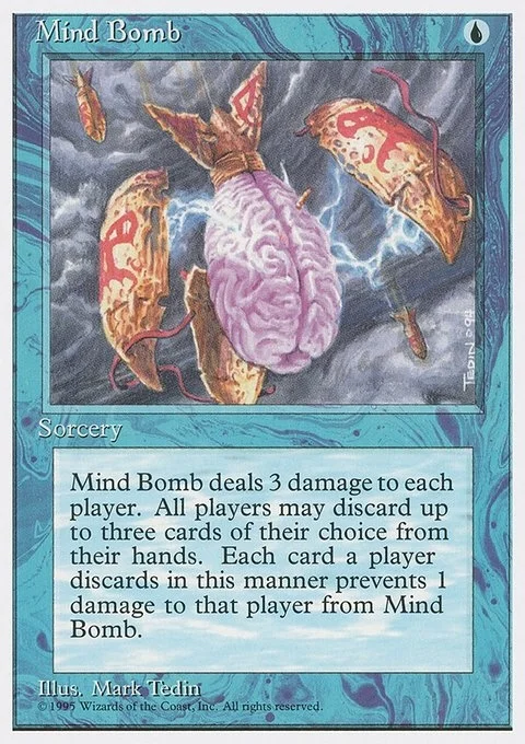 Mind Bomb deals 3 damage to each player. All players may discard up to three cards of their choice from their hands. Each card a player discards in this manner prevents 1 damage to that player from Mind Bomb.