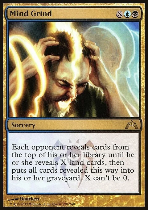Each opponent reveals cards from the top of their library until they reveal X land cards, then puts all cards revealed this way into their graveyard. X can't be 0.