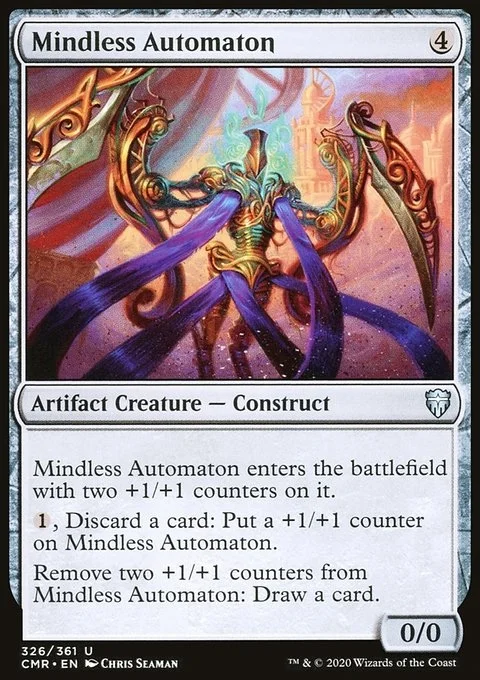 Mindless Automaton enters the battlefield with two +1/+1 counters on it. {1}, Discard a card: Put a +1/+1 counter on Mindless Automaton. Remove two +1/+1 counters from Mindless Automaton: Draw a card.