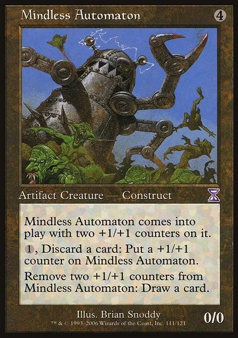 Mindless Automaton enters the battlefield with two +1/+1 counters on it. {1}, Discard a card: Put a +1/+1 counter on Mindless Automaton. Remove two +1/+1 counters from Mindless Automaton: Draw a card.