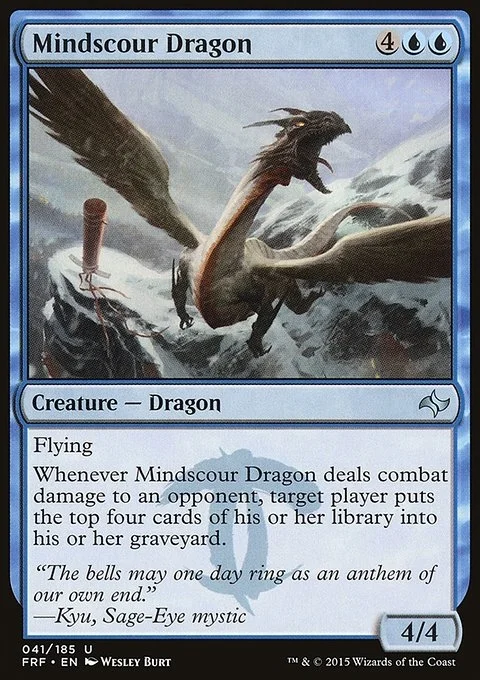 Flying Whenever Mindscour Dragon deals combat damage to an opponent, target player puts the top four cards of their library into their graveyard.