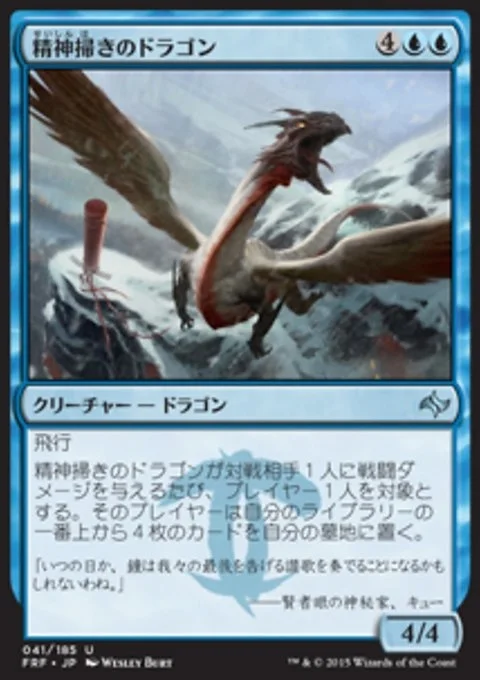 Flying Whenever Mindscour Dragon deals combat damage to an opponent, target player puts the top four cards of their library into their graveyard.