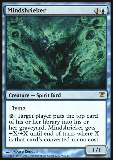 Flying {2}: Target player puts the top card of their library into their graveyard. Mindshrieker gets +X/+X until end of turn, where X is that card's converted mana cost.