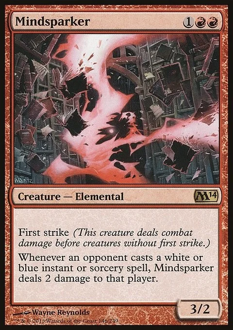 First strike (This creature deals combat damage before creatures without first strike.) Whenever an opponent casts a white or blue instant or sorcery spell, Mindsparker deals 2 damage to that player.