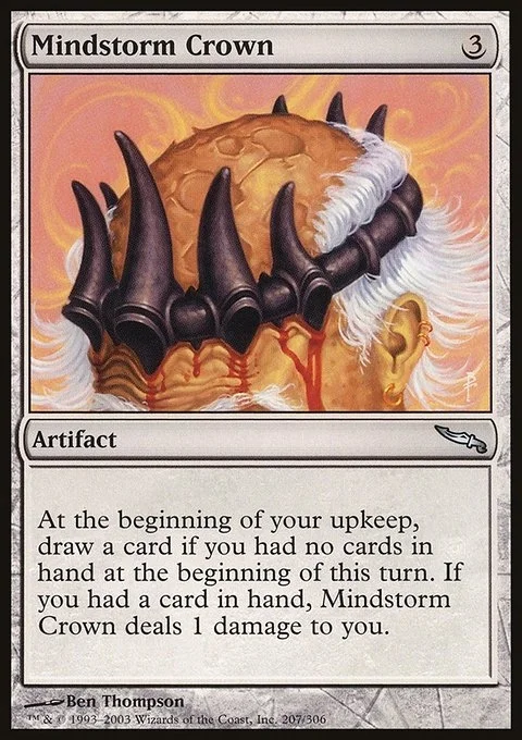 At the beginning of your upkeep, draw a card if you had no cards in hand at the beginning of this turn. If you had a card in hand, Mindstorm Crown deals 1 damage to you.