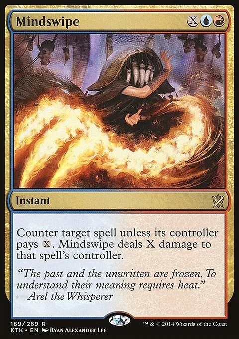 Counter target spell unless its controller pays X. Mindswipe deals X damage to that spell's controller.