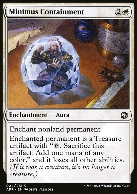 Enchant nonland permanent Enchanted permanent is a Treasure artifact with "{T}, Sacrifice this artifact: Add one mana of any color," and it loses all other abilities. (If it was a creature, it's no longer a creature.)
