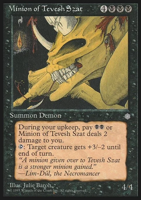 During your upkeep, pay BB or Minion of Tevesh Szat deals 2 damage to you.T: Target creature gets +3/-2 until end of turn.
