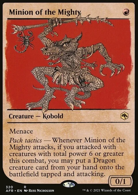 Menace Pack tactics — Whenever Minion of the Mighty attacks, if you attacked with creatures with total power 6 or greater this combat, you may put a Dragon creature card from your hand onto the battlefield tapped and attacking.
